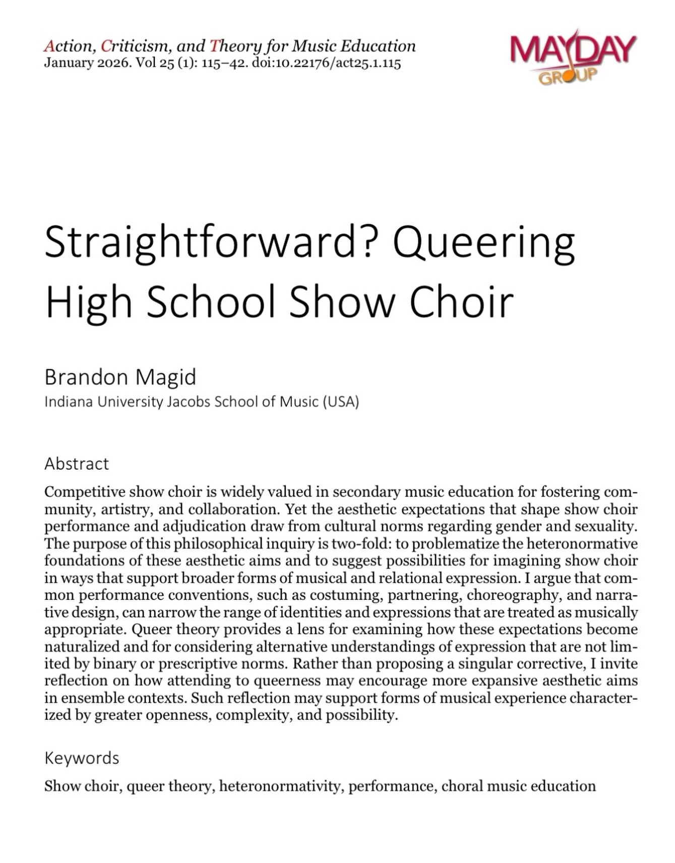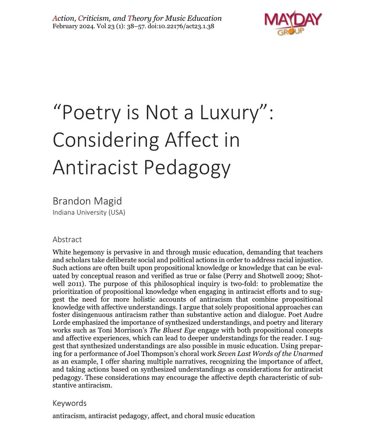 As a scholar, his work has been featured at national conferences including the American Educational Research Association and the MayDay Colloquium, and published in Action, Criticism, and Theory for Music Education and the Music Educators Journal.